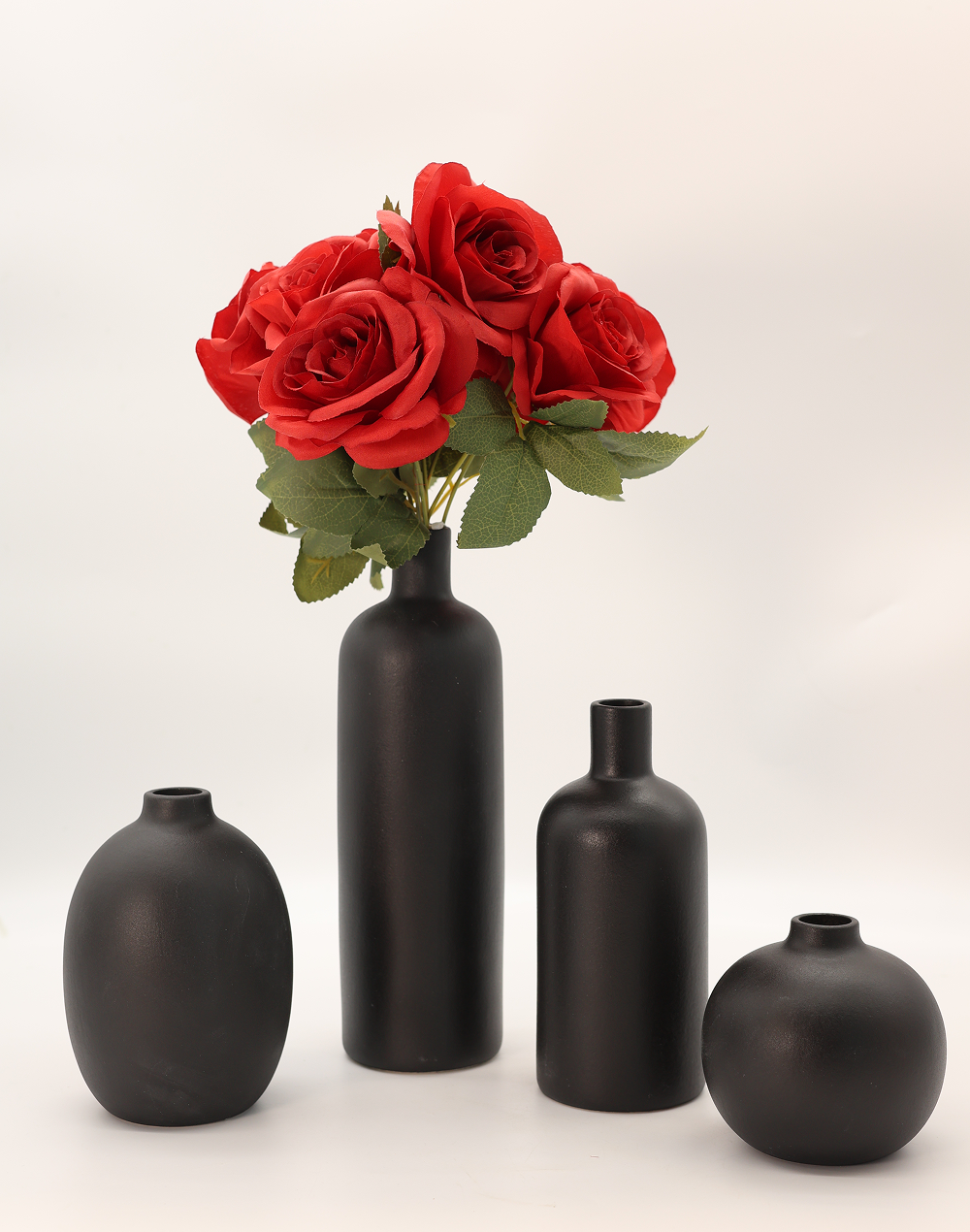 Product ID: XY107-1456Bold and refined, the Onyx Atelier Collection features four sculptural ceramic vases finished in a deep matte black tone for a striking, modern presence. Each vase showcases a unique silhouette�from elongated cylinders to rounded forms�creating a curated, gallery-style arrangement. Perfect for weddings, event styling, and contemporary interiors, this set delivers a clean, architectural aesthetic with elevated luxury decor appeal.