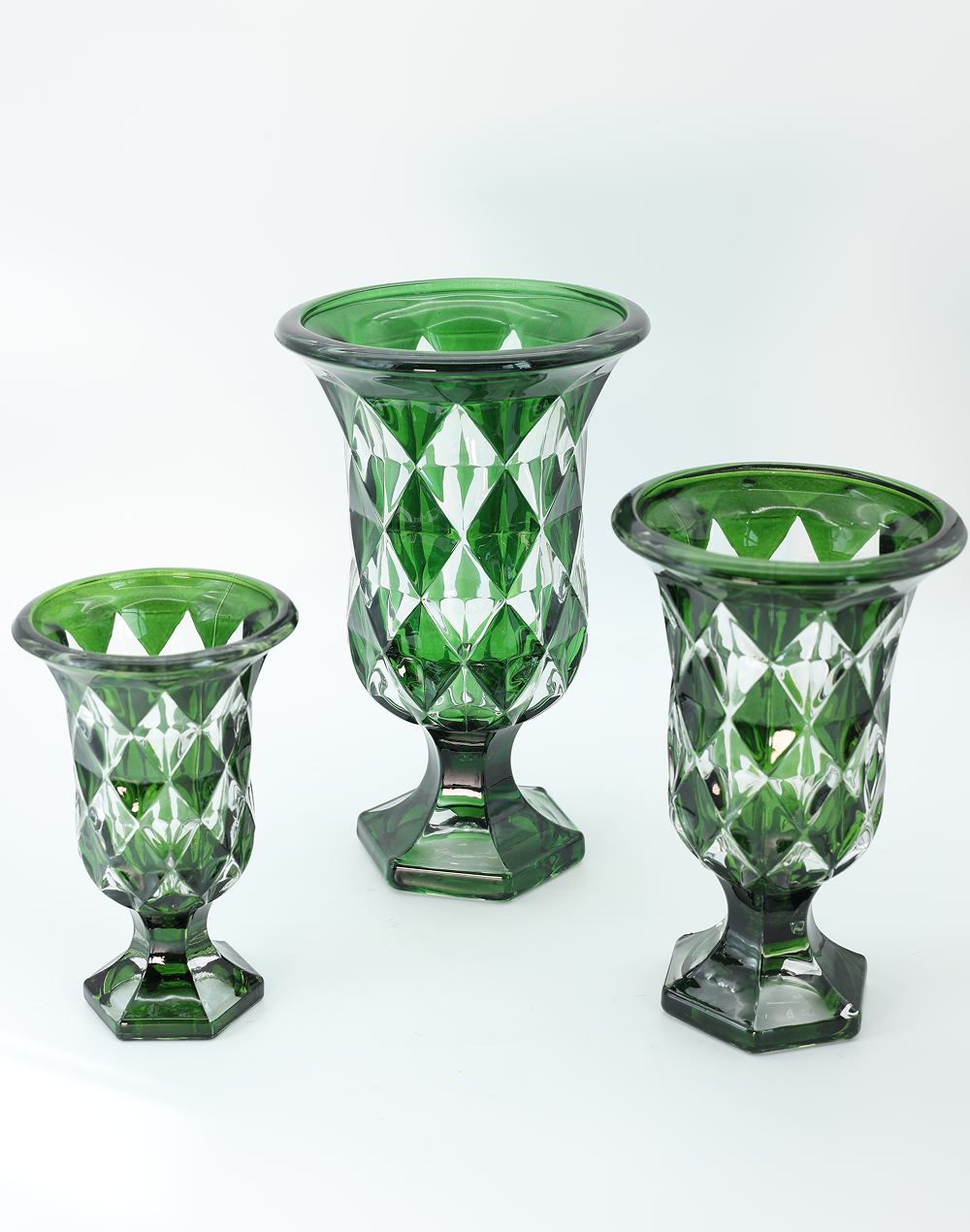 Product ID: 300G-1379The Versailles Emerald Crystal Vase Faceted Crystal features a rich green hue paired with striking geometric cuts that create a brilliant light-reflecting effect. The flared top and elevated pedestal base offer a refined silhouette, perfect for showcasing floral arrangements with added height and presence. Ideal for weddings, luxury events, and upscale home decor, this vase delivers a dramatic yet elegant focal point. A perfect choice for designers seeking a statement piece with depth, color, and timeless appeal.